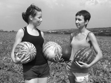 На бахче своего отца-фермера Андрея Викторовича Шляхова из Корочи сестры Людмила и Евгения трудятся наравне с наемными рабочими. С раннего утра до позднего вечера, даже на почти сорокаградусной жаре, от которой можно спрятаться разве что под натянутым небольшим шатром, девушки торгуют арбузами. Только успевают поворачиваться – толпы покупателей приезжают сюда со всей области за отменной полосатой ягодой.